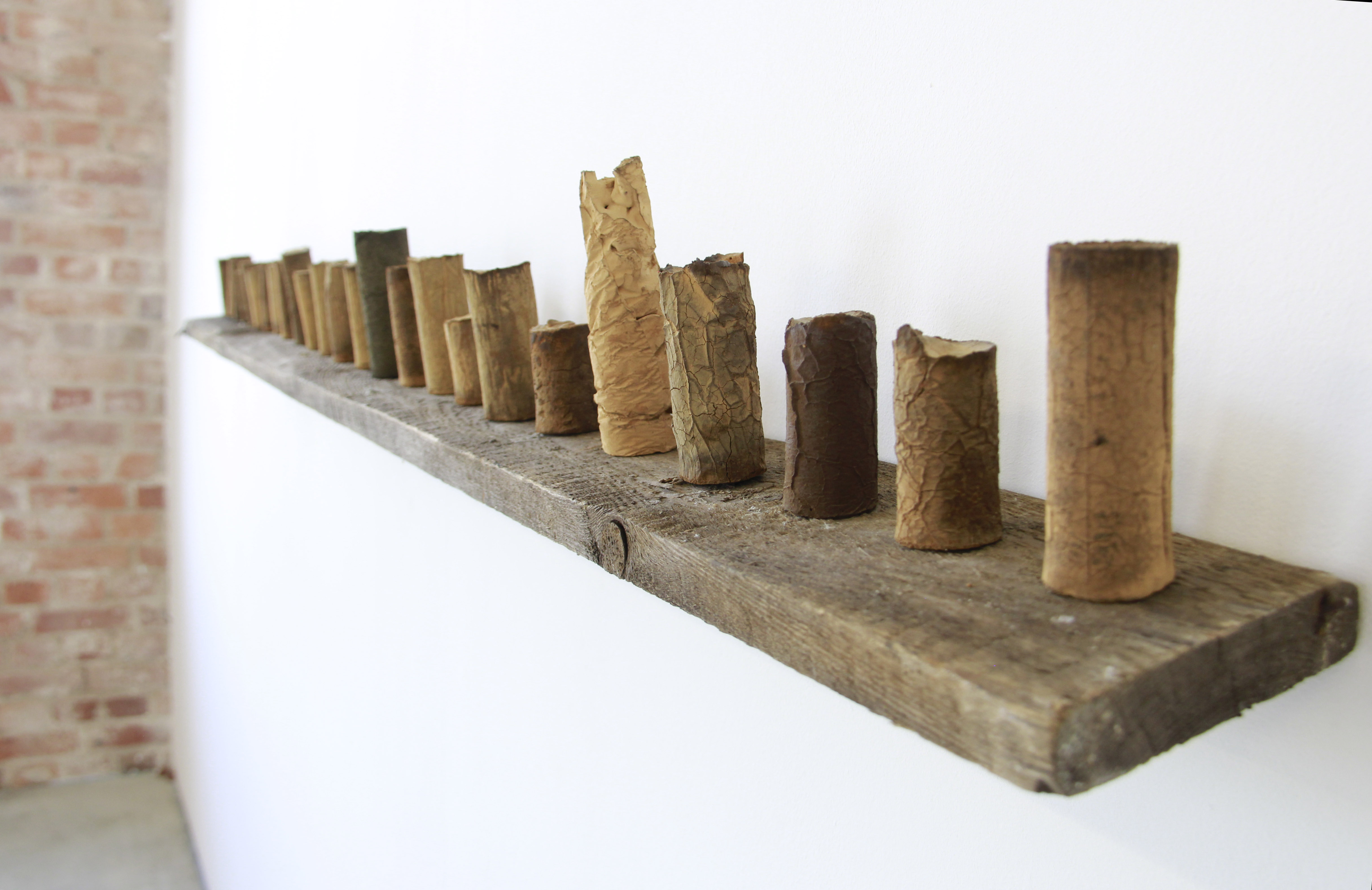 -Christy Wittmer, Fragile Connection, 2020, Porcelain, wood, glazed soft brick, 50” x 11.5” x 11.5”